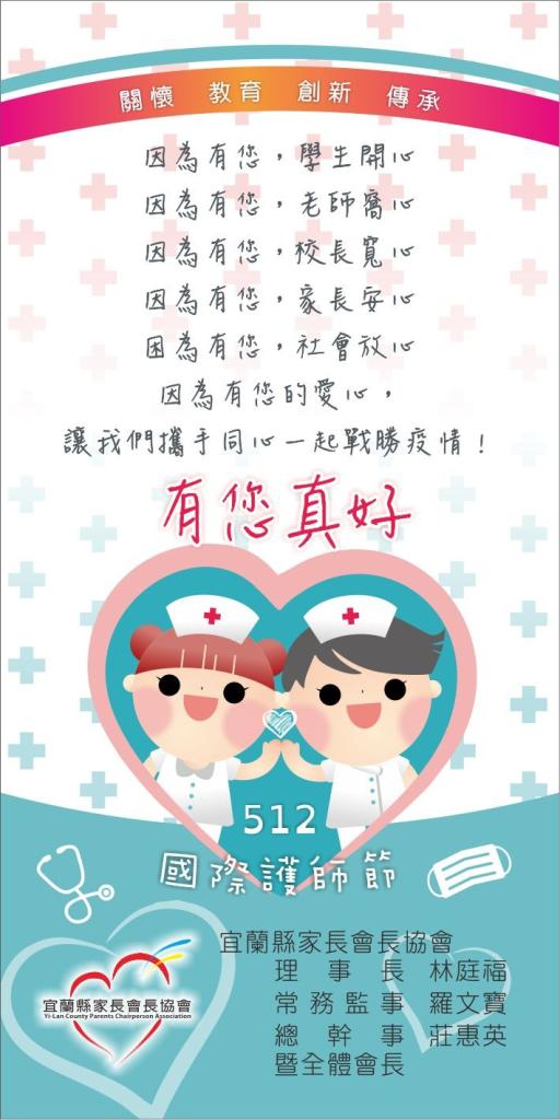 109年5月7日(週四)上午09:30在宜蘭國中,全縣會長同步會師出發,代表全縣學生家長並由家長會長協會現任及歷任理事長以及各鄉鎮市會長聯誼會總會長帶領親訪全縣計111所各級學校,總計130位護理師,關懷慰勉其防疫之功及照護孩子們的辛勞,並祝福母親佳節及國際護師節快樂!